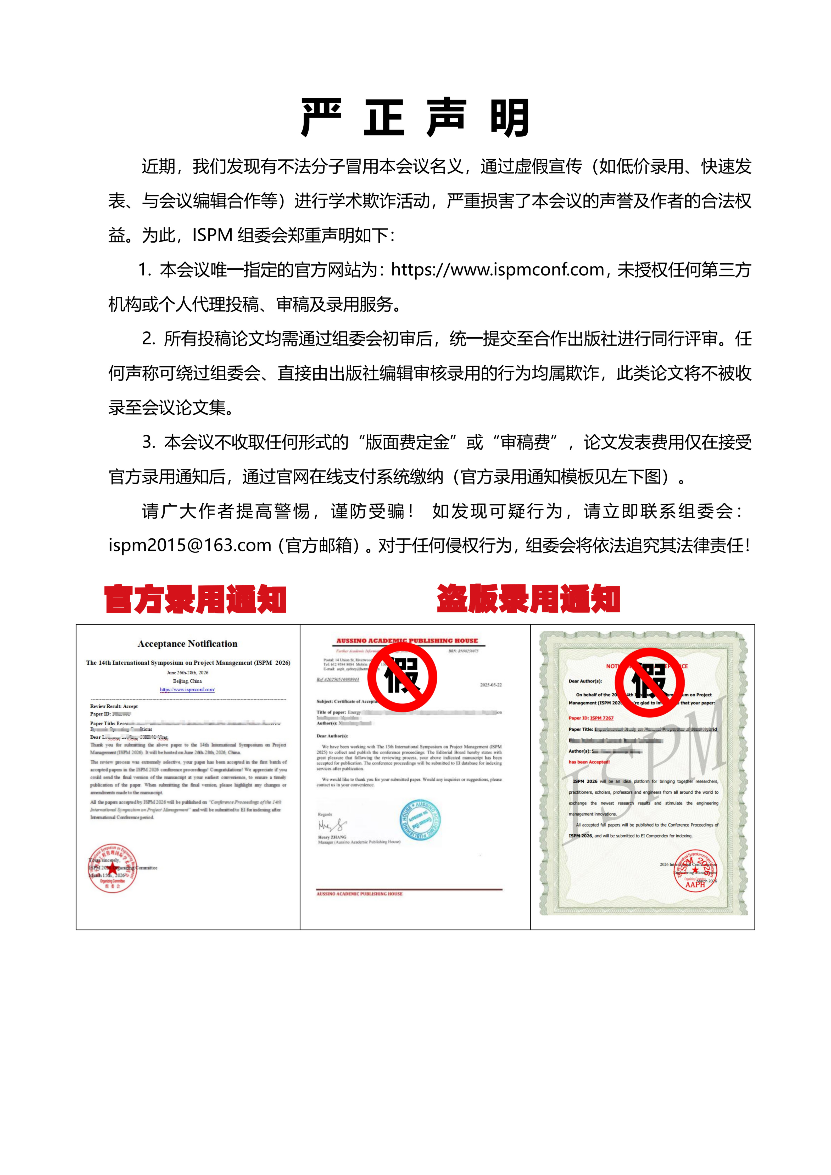 The 14th International Symposium on Project Management (ISPM 2026) will be held in Beijing, China during June 26-28th, 2026, hosted by Beijing Engineering Management Science Institute, Beijing University of Civil Engineering and Hubei Zhongke Institute of Geology and Environment Technology.